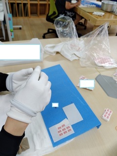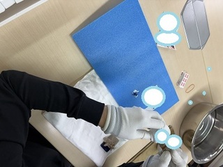 机の上にタオル、マット、ゴムヘラ、シール、水桶を自分が使う道具の準備です。