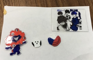 下絵にプラ板を置いてテープで固定して、黒ペンで輪郭をなぞって…