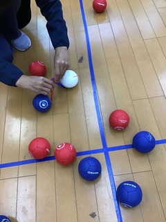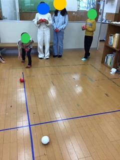 全員がボールを投げおわったら、ジャックボールに1番近いボールが得点となります。みんなでどれが1番近いかな?確認してみましょう、どっちかな?
