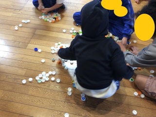 今日はペットボトルキャップや積み木を使って、約40分の活動時間内でどのくらいの