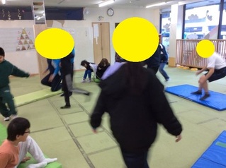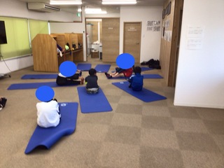 緑マットと青マットを円状に並べその周りを音楽が流れている間は周りを歩き
