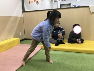 室内で職員手作りすごろくが盛り上がってしまったので、きなこと軽乗ではなく、ちびまるに跳び乗りを行いました。