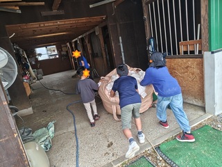 みんなで「よいしょよいしょ」と力を合わせておが粉を運びます。