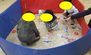 今日は、1つの大きな池を用意して活動を行いました。2つのグループに分かれ、2分ごとに交代しました。活動内容は、2分間音楽を聴きながら池の中の魚をできるだけ多く釣りあげるゲームです。
