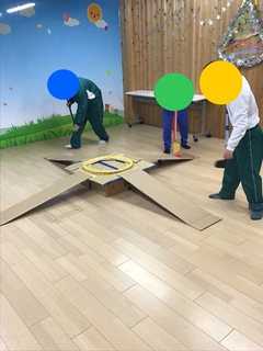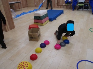 子どもたちと一緒に協力しながら、トンネルコーナー・ケンケンパコーナー・跳び箱コーナー・ゲジゲジボールコーナーなどを作り、ノリノリの音楽にあわせてみんなが楽しく渡れるサーキットコースを完成させました。