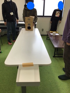 段ボールの空気砲を撃って紙コップを動かし、机の端に付いている箱の中に・・・