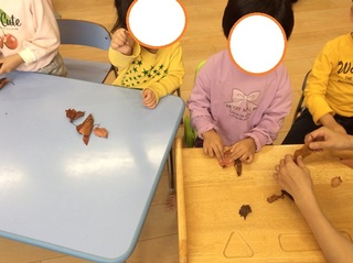 最初に、落ち葉の触覚を楽しみながら、どんな落ち葉があるかな?と、触って見ていきます(*^^*)