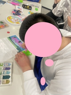 トレーにビーズを入れてペンでどんどん貼り付けていきます。