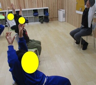 まずは、座ってリズトレ。職員の手本をよく見て、手を振ったり腕を回したりできました。