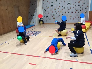 今日のキッズの活動は、体幹を鍛えよう!バランスボールです。