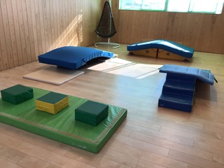 今日は坂道クッションや座布団に大きいマットを敷き、他にもマットの上にブロッククッションを乗せたものを使ってその上を歩きました。