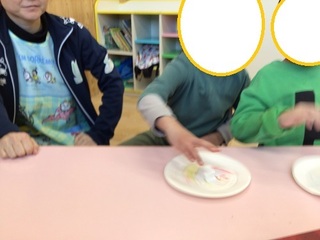 少しベタベタする紙粘土の触感に少し驚きながらも、みんな一生懸命こねていきます(*^^*)