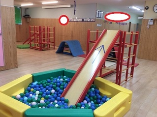 今日はジャングルジムを平均台で囲んで、写真では見にくいですが、ビニール紐をジャングルジムと壁に繋いで、潜ったり、跨いだりして遊びました