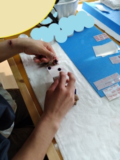 今日の施設内軽作業はカーム箱詰めの納品へ向かうチームとおちょこのシール貼りチームで