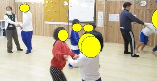 仲間の位置をよく見て手をつなぎ、回りました。総合的に目と身体を使います。