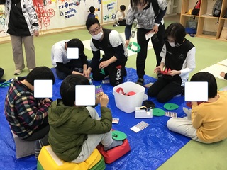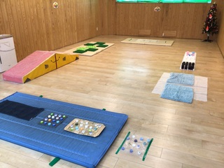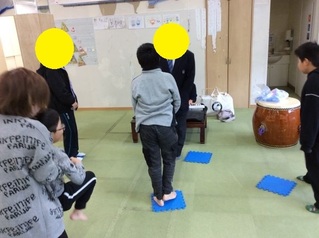 青いマットの上に乗り音楽に合わせて左右にジャンプしました。