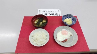 本日のメニューは「ベーコンエッグ」「リンゴ」「味噌汁」「ご飯」です。