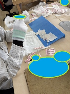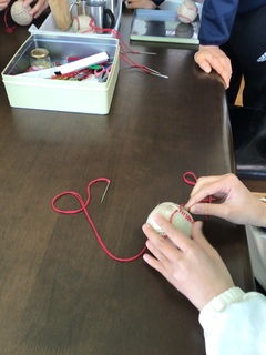 本日の活動は「エコボール活動」。新しい体制になってからは初めての取り組みでした。虹色DAYSではこれまでにも何度か行ってきた活動ですが、今年度から異動してきた職員の中には未経験の人もおり、まずは経験のある利用者さんにお手本を見せてもらいながら、縫い方の復習からスター・・・