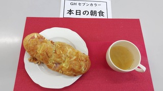 朝ご飯は起きてきた順番に食べます。メニュー「ベーコンチーズフランスパン」「コンソメスープ」でした。