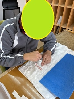 苦手な利用さん まっすぐ貼るのが苦手な利用者さん 個々に苦手を克服するように
