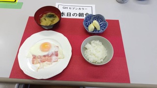 こんにちは 本日のセブンカラーです。 今日は週末ですね。頑張って行きましょう! 皆さん朝起きてきて、「おはようございます」の挨拶をして今日はゴミ捨ての日なので利用者たちで 一緒にゴミ捨て場所へ捨てに行きました! 本日の朝食は「ベーコンエッグ」「味噌汁」「白ご飯」「りんご」で・・・