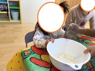 こんにちは(^^)/ 今日は小麦粉を使って粘土を作りました。 まずは、小麦粉に水を入れます 写真では隠していますが二人とも興味深々過ぎて口が開いていました(笑)