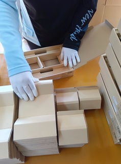 今日の施設内軽作業は おちょこのシール貼りプログラムと箱詰め作業を行いました。