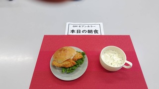 本日の朝ご飯は「フィシュバーガー」「ミルクコンソメスープ」です。