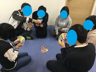 本日の活動は「カードゲーム」でした!今回は2つのグループに分かれ、人気のカードゲーム「ウノ」を行いました。高校生ということもあり、ただカードを出すだけでなく「次はこの色に変えよう」「ここで逆・・・
