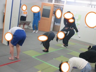 いつもの脳トレとは違い、インタラクティブウォームアップと言う動画を流し、スクリーンで体を動かしていきました。