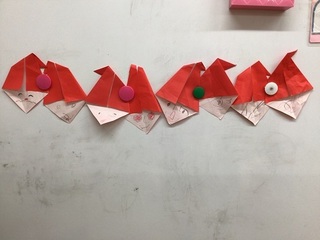 サンタとキャンディーを折り紙で折ってツリーに飾りました